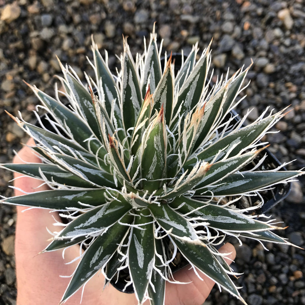 De Agave schidigera , ook wel bekend als de 'Thread Agave', is een sierlijke, compacte agavesoort die opvalt door zijn donkergroen, kleine bladeren met decoratieve witte filamenten langs de bladranden. Dit geeft de plant een uniek, speels uiterlijk dat perfect is verleden in een moderne of woestijntuin. Oorspronkelijk veroorzaakt uit de bergachtige streken van Mexico, is deze agave bijzonder geliefd bij liefhebbers vanwege zijn onderhoud opmerkelijke en bijzondere verschijning.